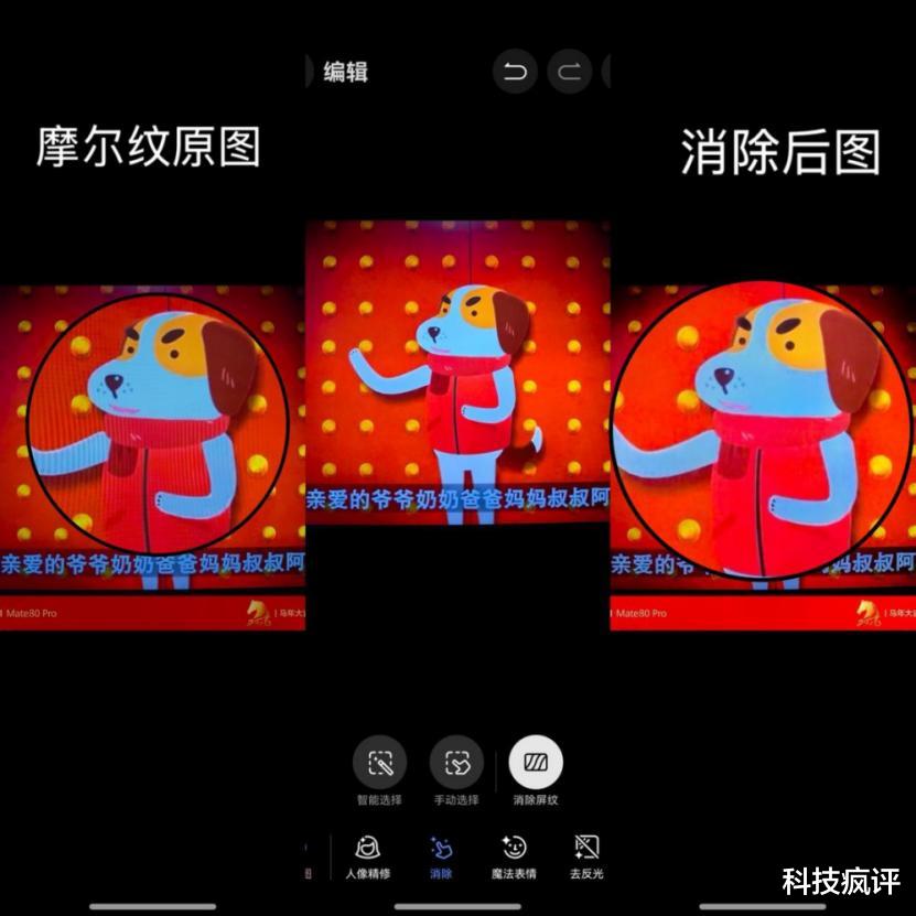 还有一个我用得非常高频的功能,就是它的AI修图。比如拍电视、拍大屏幕时,很容易出现屏纹,之前遇到这种情况基本只能放弃。但这次用华为Mate 80系列,很多照片直接在相册里用 AI修图就能把屏纹处理掉。这种功能平时可能不太会注意,但在春节这种高频拍照、分享的场景下,确实能明显提高成片率。