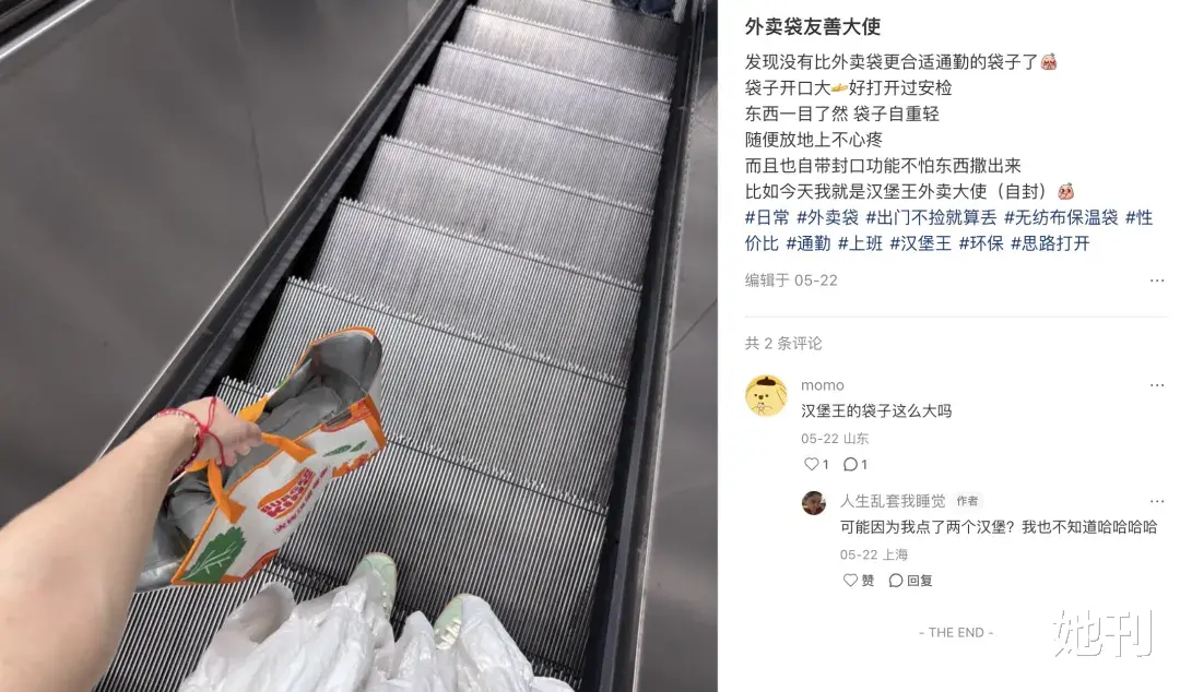 更离谱的是,平时大家都看不起的外卖袋子,也成了通勤人的心头好。该省省,该花花,外卖袋子必须带回家。而有的外卖袋子有保温层,更是带饭人士的最爱。曾经的“一次性”外卖袋,如今好像被赋予了全新的意义。而且据说在非洲,中国的外卖袋子已经成了最时尚的单品。