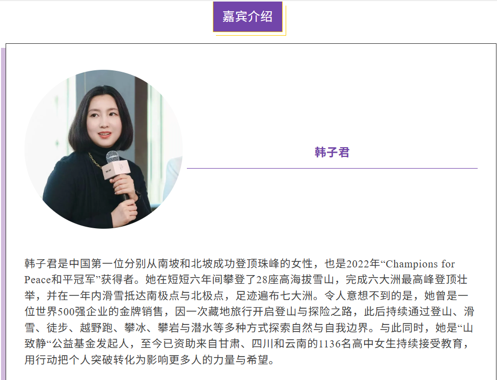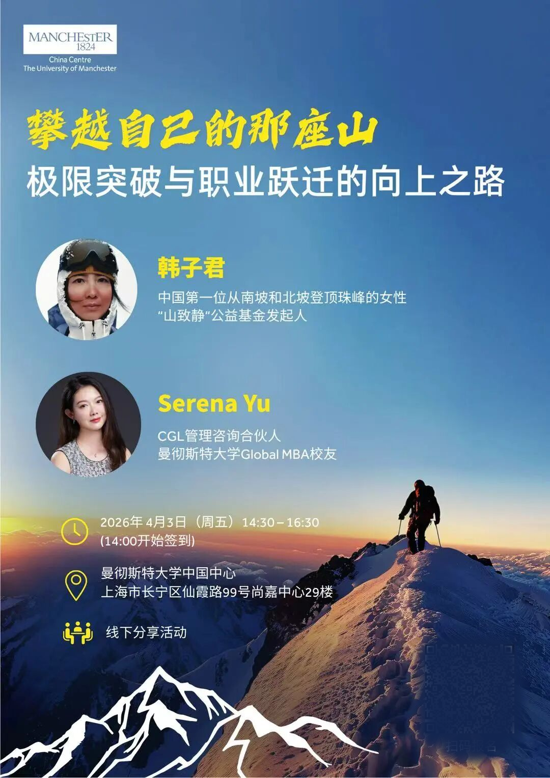 4月3日(星期五)下午,我们将邀请中国首位分别从南北坡成功登顶珠峰的女性代表韩子君女士和CGL管理咨询有限公司合伙人、曼彻斯特大学全球MBA校友Serena Yu女士为我们带来一场关于勇气、坚持与超越的深度对话。欢迎大家报名。
