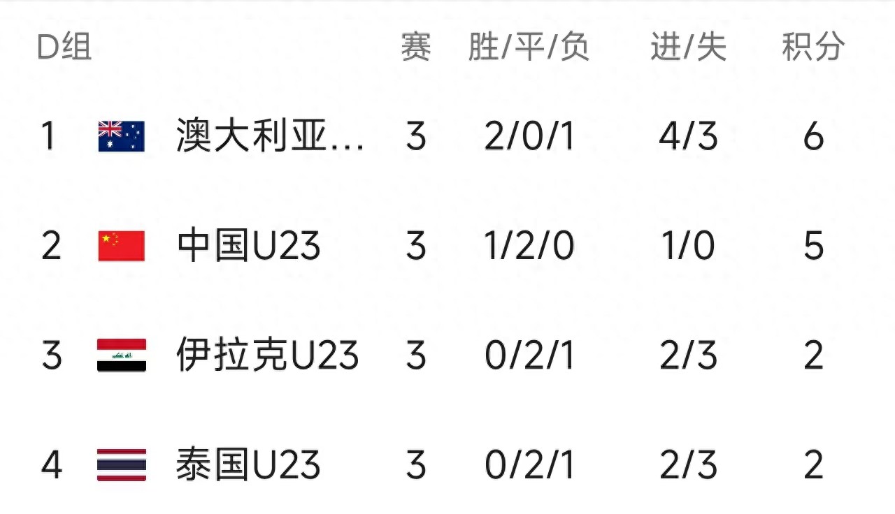北京时间1月14日,U23亚洲杯小组赛最后两场比赛结束,中国队和澳大利亚队拿到了最后两个八强席位!中国队0-0闷平泰国队,最终以1胜2平积5分不败的成绩小组第二晋级;澳大利亚在伤停补时连入两球,2-1逆转绝杀伊拉克队,以2胜1负积6分抢到了头名!其余晋级8强的球队还有越南、约旦、韩国、乌兹别克斯坦、日本、阿联酋。