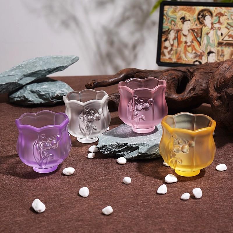 杯壁厚度的细微差异,更是让光线在其中折射出层次丰富的光晕。当你往杯中注入茶汤,奇妙的事情发生了,茶汤的颜色与琉璃的色彩相互交融、映衬,宛如铃兰花在水中再度绽放,为平凡的品茗时光增添了几分诗意与浪漫 。