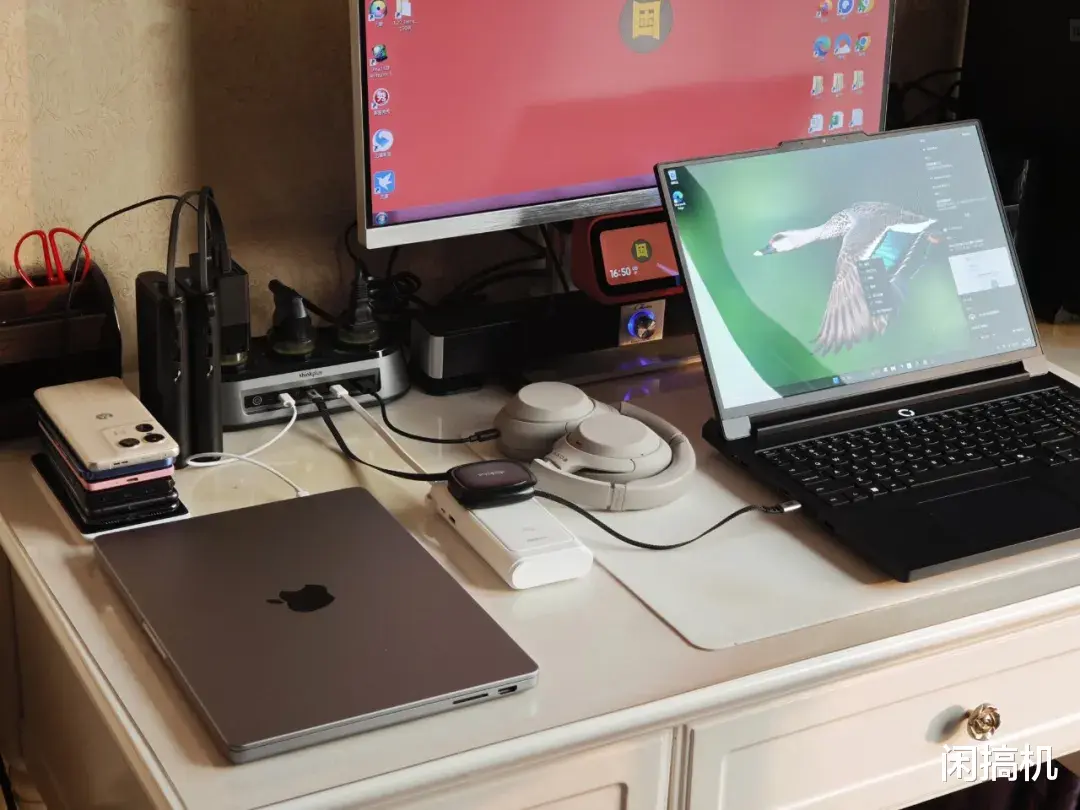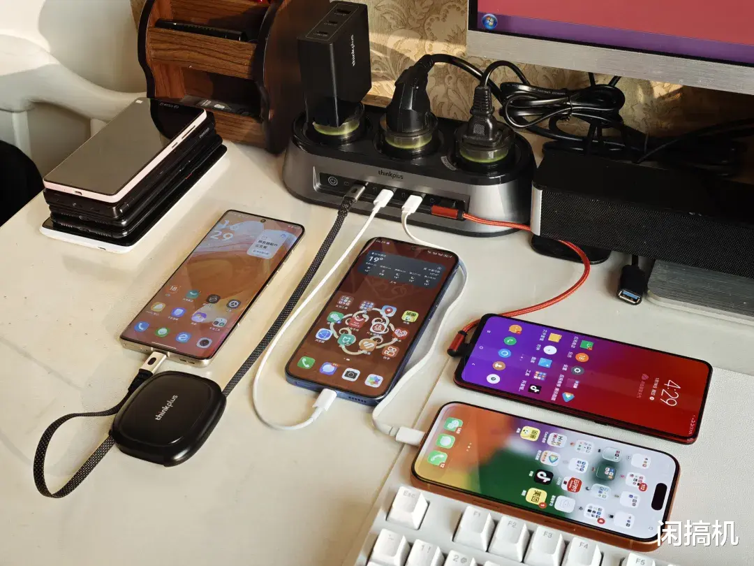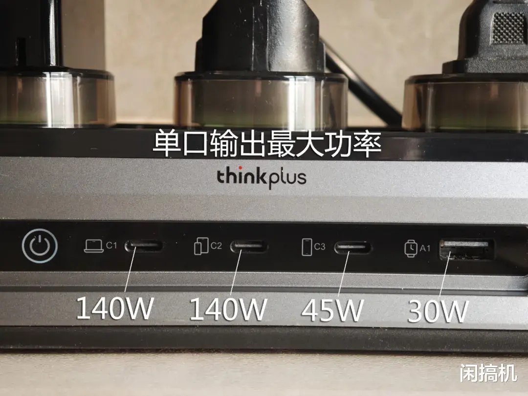 我还插了1个thinkplus140W三口充电器,等于再分出三个口,解决了充电头凌乱的问题。在已给电脑与显示器供电的前提下,还可以同时给2台笔记本+3个充电宝+1部手机+1个头戴耳机充电。