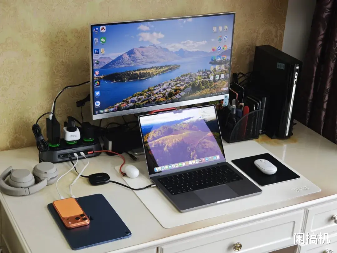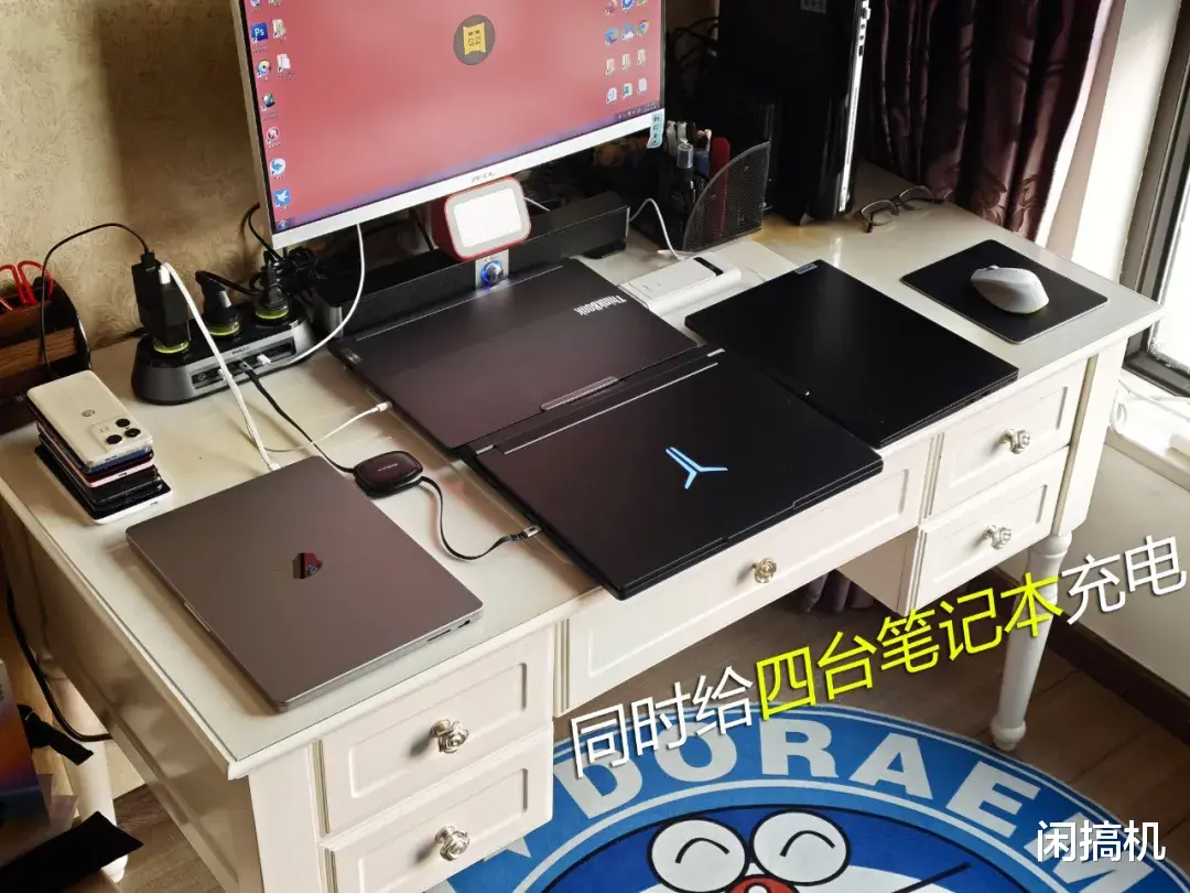 由于thinkplus桌面充电站的最大负载是2500W,只要合理利用,就能同时给桌面上所有设备供/充电。以我情况为例,除了给桌面的台式机、显示器和音箱供电外,还同时能给4台笔记本快速充电。
