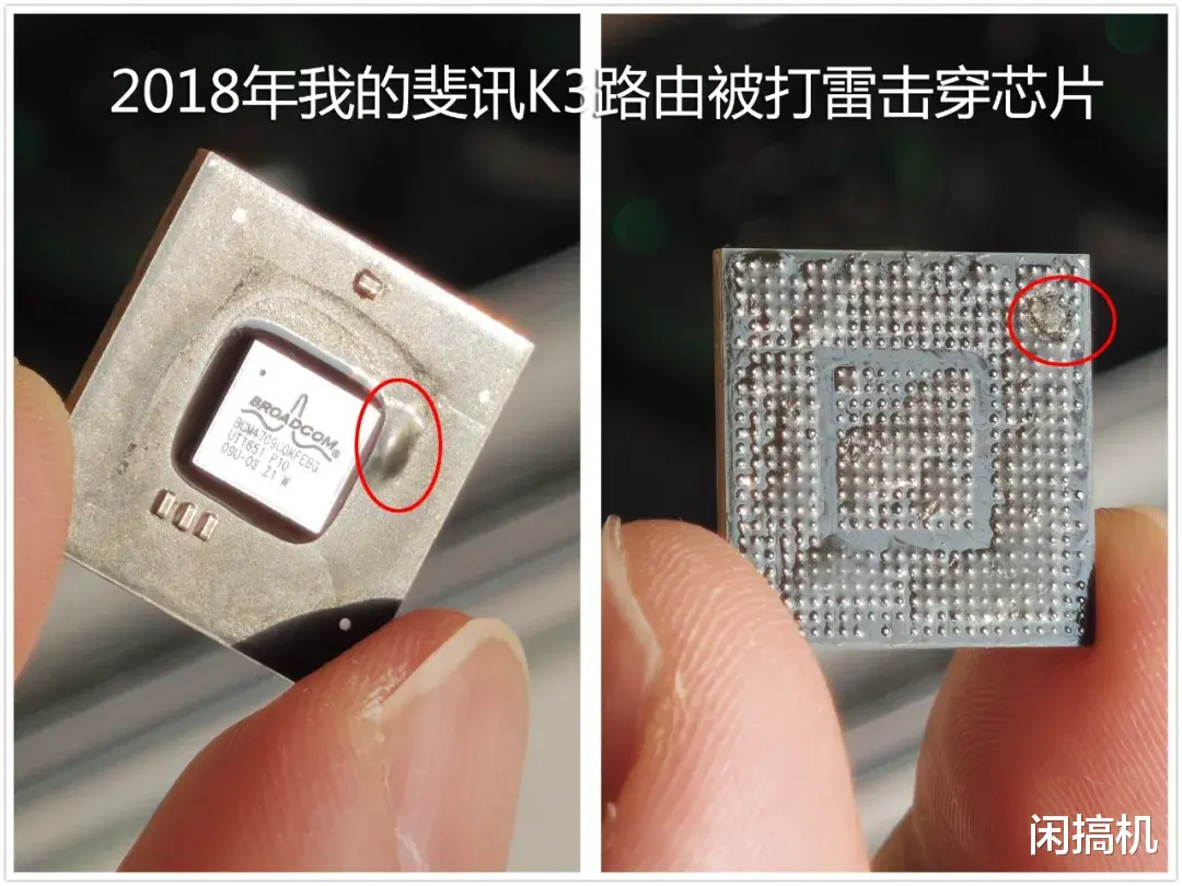 这是我家被雷劈坏的斐讯K3路由的芯片,当年花了1999元返现12期可实现零元购,结果还没用几个月,就被雷劈坏了。我不甘心去闲鱼找了师傅寄修,拆开发现博通BCM4709C芯片被打雷击“鼓包”了,背面焊点也有灼烧痕迹,花高价换了芯片才修好。