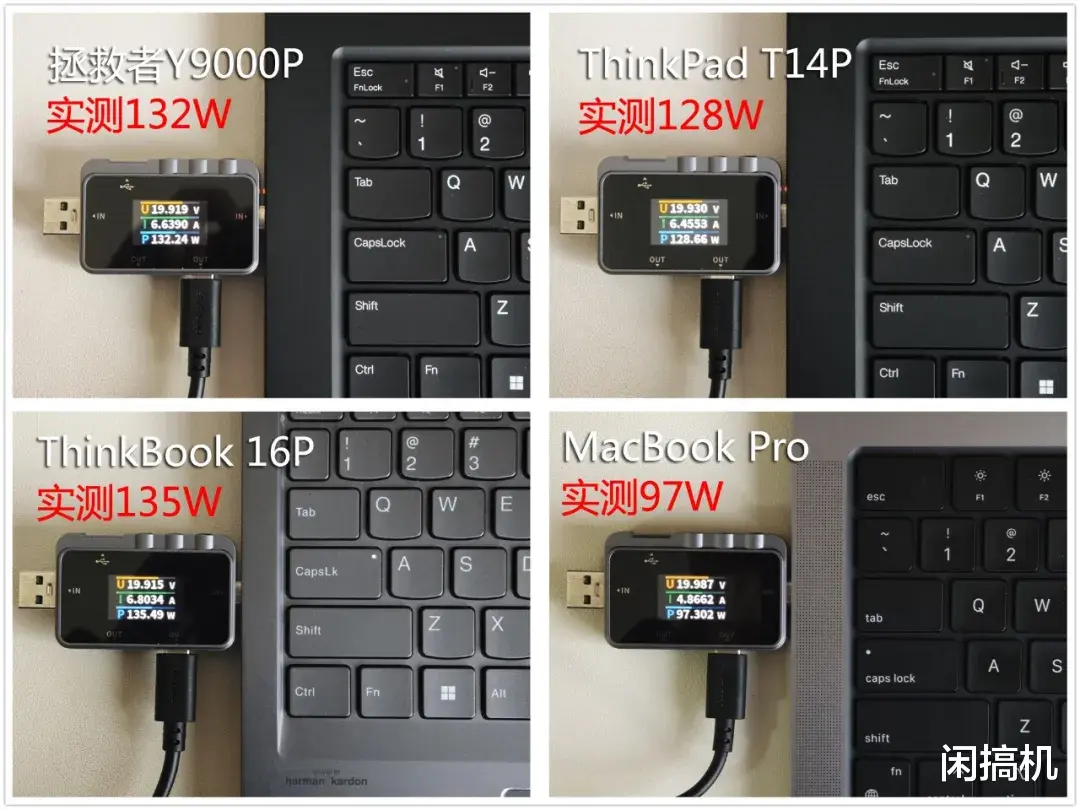 再派出三位笔记本选手,ThinkBook 16P实测135W,ThinkPad T14P实测128W、MacBook Pro实测97W,几乎都达到了各自C口的峰值上限。