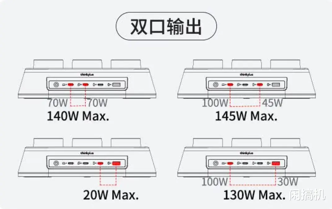 双口最大输出功率是145W,主要有三档:C1/C2(100W)+C3(45W)、C1(70W)+C2(70W),C1(100W)+USB(30W)。