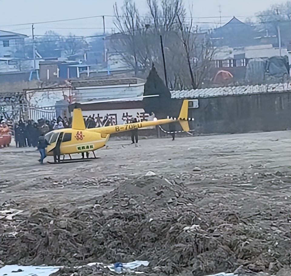 1月29日,有多名网友在社媒晒出了一架黄色直升机的照片,照片中直升机停在一处空地上,上面明显写着大红色的双“囍”字样。