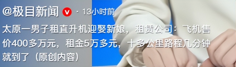 据极目新闻报道,山西太原一男子租直升机迎娶新娘,引发了众多网友围观!