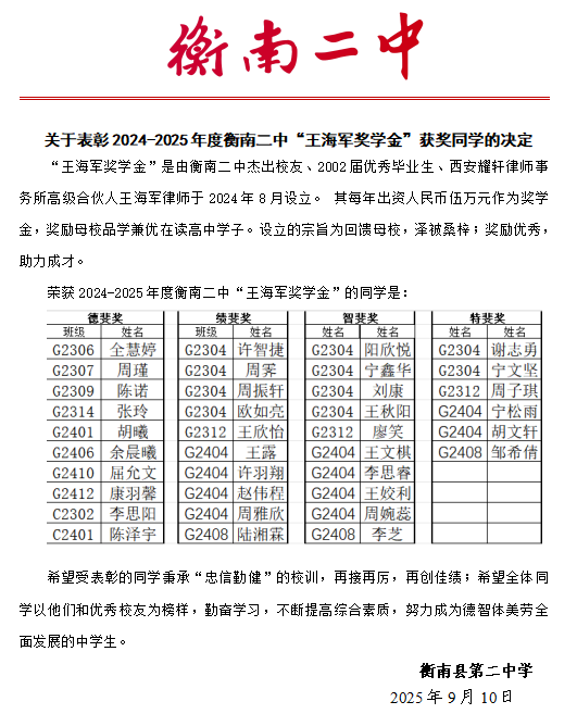 “王海军奖学金”的颁发成为活动又一高潮。36名优秀学子依次上台,从学校领导手中接过属于他们的荣誉。这份奖学金源自衡南二中优秀校友王海军先生的慷慨捐赠,不仅是对学业的肯定,更是一种精神的接力和价值的延续。