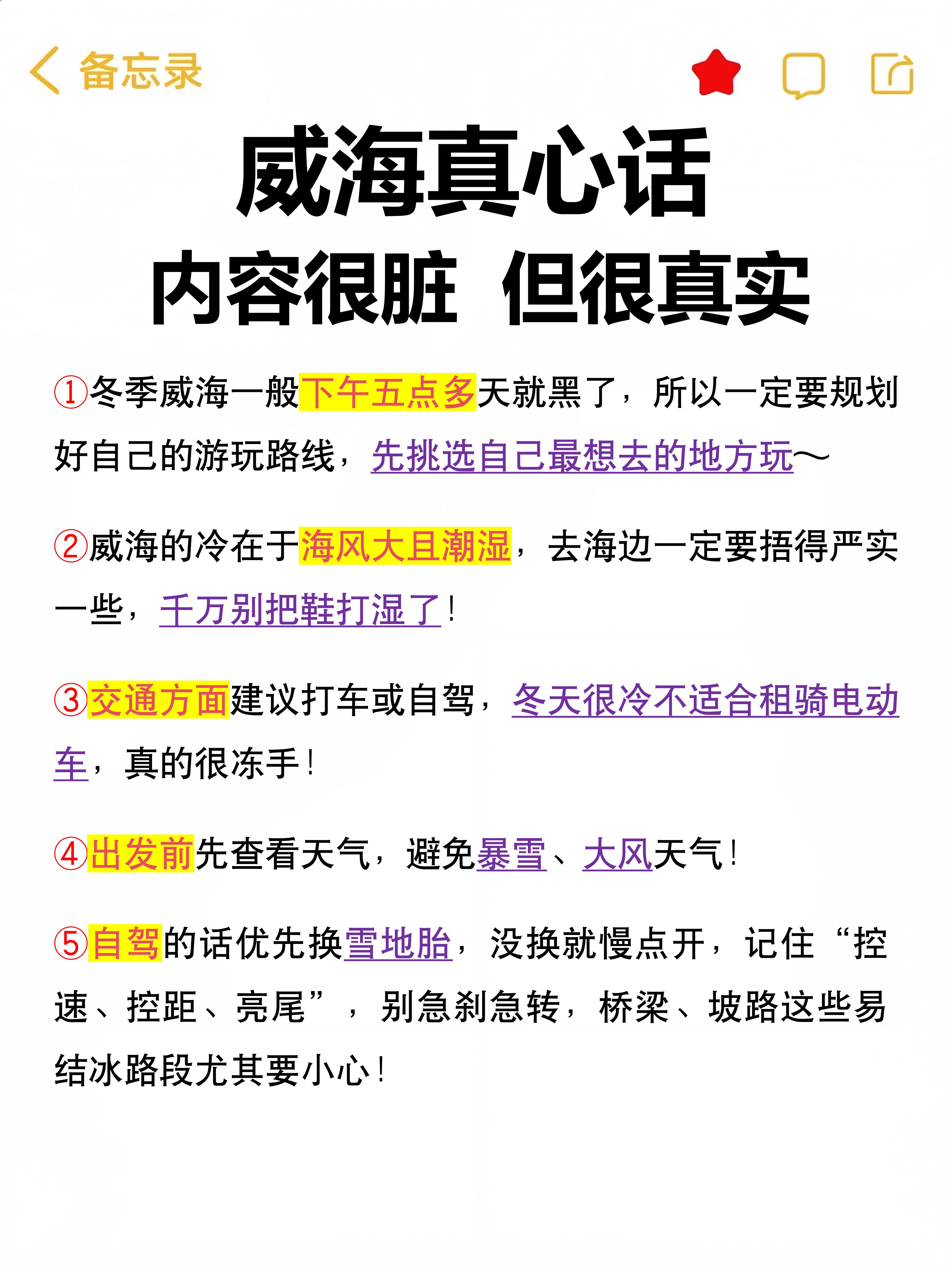 ❄️冬季威海一般下午五点多天就黑了,所以一定要规划好自己的游玩路线,先挑选自己最想去的地方玩~出发前记得先查看☀️天气预备,避免暴雪、大风天气!