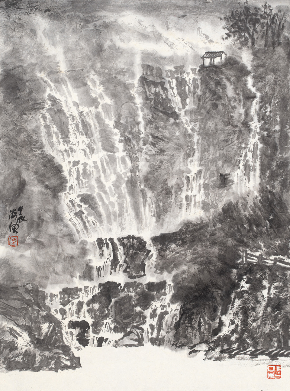 太行山,外观似与水的柔美截然不同。作为北方山脉的典范,其以石壁嶙峋、悬崖陡峭而彰显刚毅之气,似乎与水之润泽之轻柔形成鲜明对比。然而在精神层面,太行实与水脉相通——它如凝固的波涛,将大地往昔的激荡定格为永恒之雄奇。山势起伏犹似水波韵律,岩层纹理则如时光流淌的印记。太行,可谓是地质意义上的“水之化石”,在静默中承載亿万年自然造化,延续着水的精神脉动。何海阔的山水艺术,正是敏锐捕捉到太行这一独特气质,整体风格既得北派山水雄强之势,又隐蕴水韵的灵动与婉转。在技法层面,他融汇宋人笔意,娴熟运用“雨点皴”、“落茄皴”等法,兼糅以元代以降的水墨趣味,以水破墨,湿笔块面造型,枯笔层层皴染,泼破水法兼施,于温润含蓄的墨色中构建出山体的体积与沧桑。故而其笔下山峦,多以饱含水分的墨色成形或者灰色墨线勾勒,方笔之中刚柔相济。构图则近观恢弘磅礴,远望灵秀化境,于雄厚中见精微,在刚健中藏柔和。这不仅是对太行山形的摹写,更是对其内在精神的深刻领悟——那是一种历经岁月沉淀后的沉静与包容。