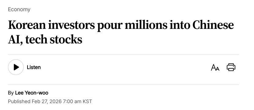 【环球网财经综合报道】据TheKoreaTimes等外媒报道,尽管近期韩国股市跻身全球表现最佳市场行列,以交易活跃著称的韩国散户投资者仍在大幅加仓中国人工智能及科技板块相关标的。