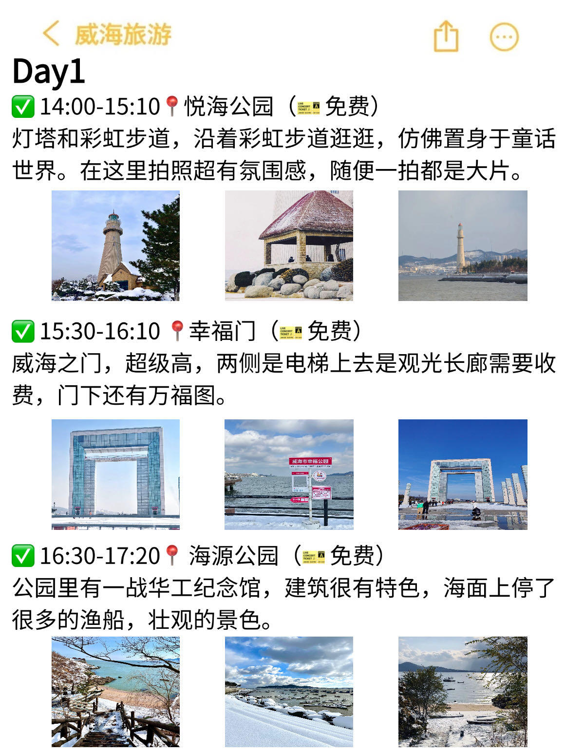 ✅第一天早上7点就冲到火炬八街📍,彩色房子配上雪景,随手一拍都好看🤩,而且这时候人少,接着溜达到国际海水浴场,然后去了威海公园的大相框🖼️,蹲下仰拍,蓝天和雪还有大相框同框,分分钟出片📷,下午去了悦海公园灯塔和彩虹步道被雪覆盖,像走进了童话世界🌍,还去了幸福门和海源公园拍照都好有氛围感🫧。
