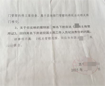 周某龙称,多年来他持续向各级部门反映情况,却遭遇重重阻碍。2025 年6 月,西和县相关单位出具《不予立案通知书》,称未发现党某贤、赵某香等人涉嫌违法犯罪;同年 8 月,黄某荣因涉嫌违法发放贷款被立案侦查,但案件因时间跨度大、涉及人员多仍在侦办中;而关于国有土地使用证违规变更的问题,被认定不属于相关机关管辖范围,需向其他部门反映。