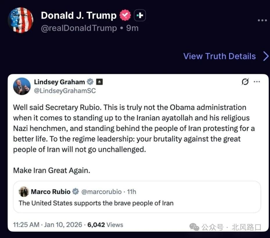 参议员林赛·格雷厄姆转发鲁比奥支持伊朗人的帖文,随后还得到特朗普转发。格雷厄姆还在另一则帖文中发出明确信息:“援助即将到来。”