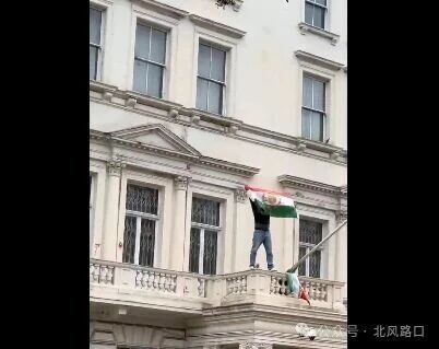 在伊朗驻英国大使馆,1名伊朗人扯下伊朗当局国旗,升起巴列维时代的伊朗国旗,这一视频得到特朗普的转发。