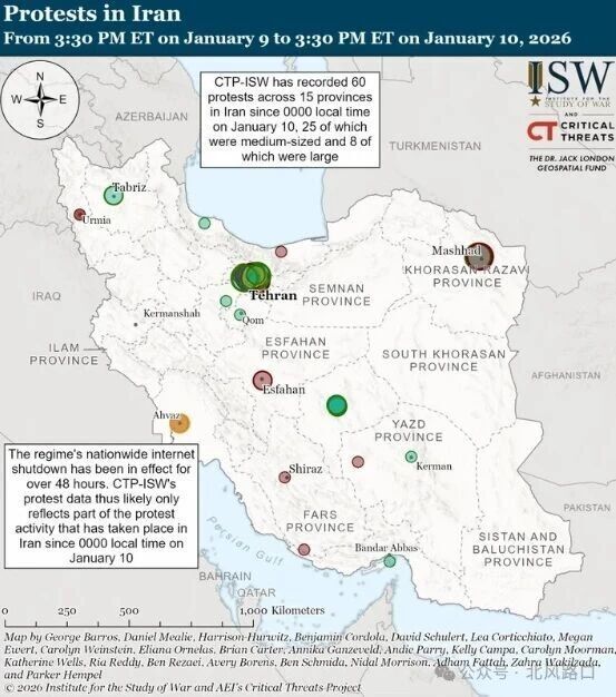 战争研究所(ISW)称,伊朗当局已将抗议者从“暴徒”定义为“恐怖分子”,这表明伊朗当局对抗议者将采取毫不妥协的立场。过去24小时,伊朗15个省份共发生60起抗议活动,与1月9日的22个省份共116起抗议活动相比稍有下降,主要原因是封锁网络导致。