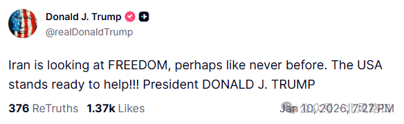 1月10日,特朗普在社交媒体发帖:“伊朗正在寻求自由,或许是前所未有的自由。美国随时准备提供帮助!!!”