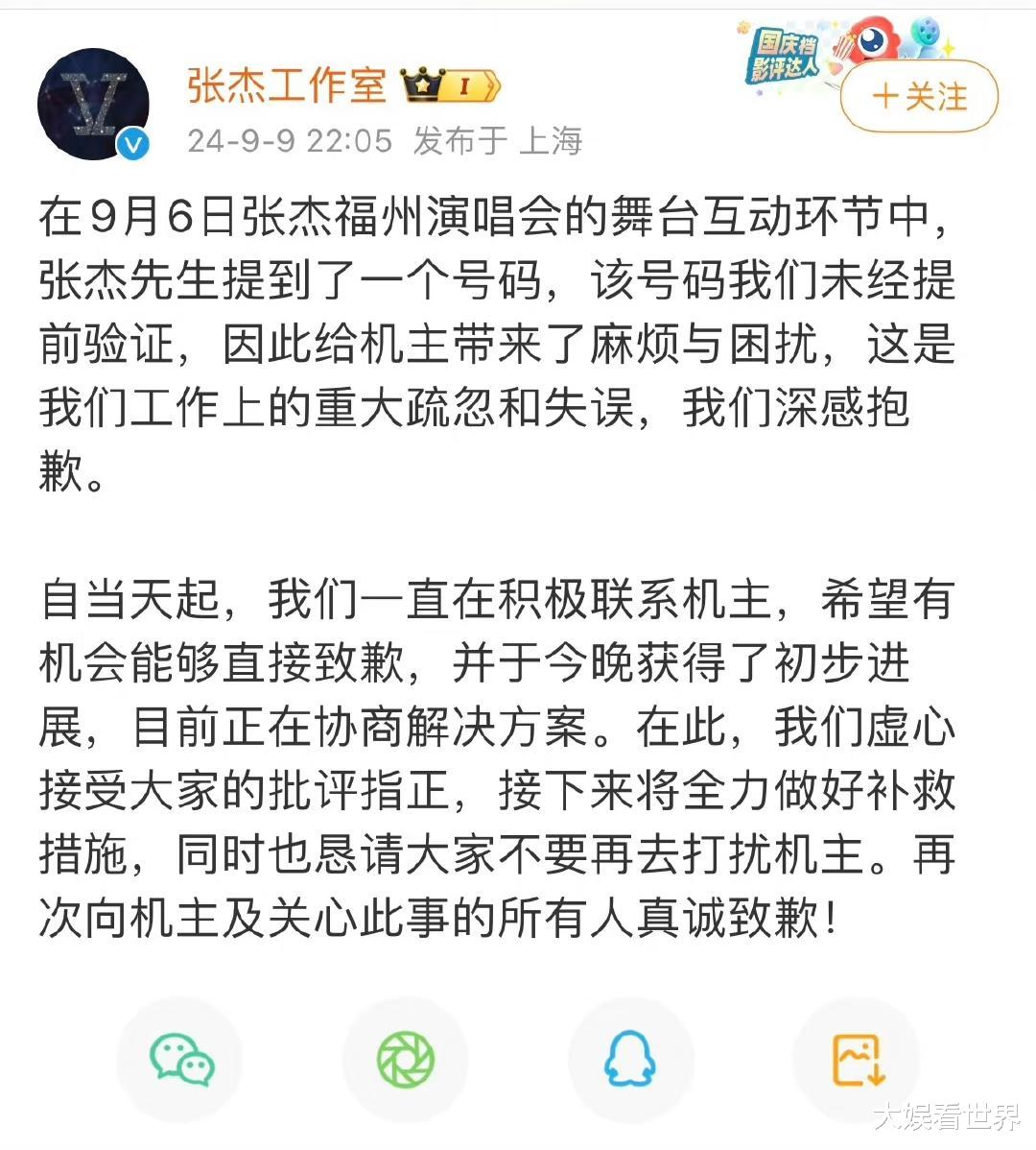 声明称:在9月6日张杰福州演唱会的舞台互动环节中,张杰先生提到了一个号码,该号码我们未经提前验证,因此给机主带来了麻烦与困扰,这是我们工作上的重大疏忽和失误,我们深感抱歉。