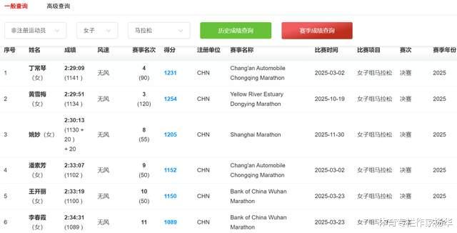 这可不是某一场成绩漏记那么简单,是她今年所有赛事成绩都被排除在外了。要知道非注册榜单的竞争逻辑很直接:比的就是硬成绩。现在丁常琴2小时29分09秒排第一,“最快女程序员”黄雪梅2小时29分51秒紧随其后,姚妙2小时30分13秒稳坐第三,按张水华常州赛2小时30分38秒的成绩,妥妥该占第四的位置,就算这场不算,她在东营金标赛跑出的2小时33分43秒也足以排在第六,怎么着都轮不到3小时30分的选手都能上榜,她却连门槛都没摸着。