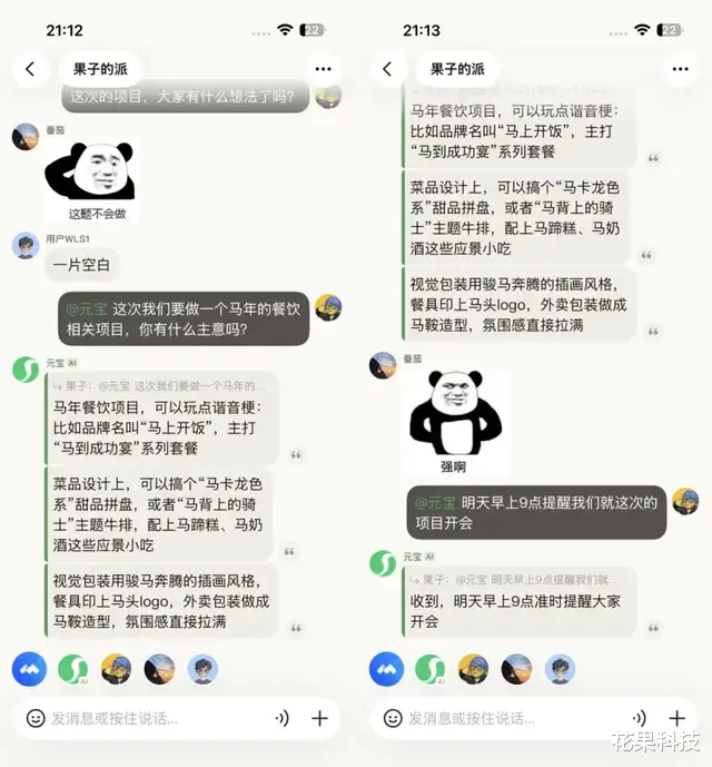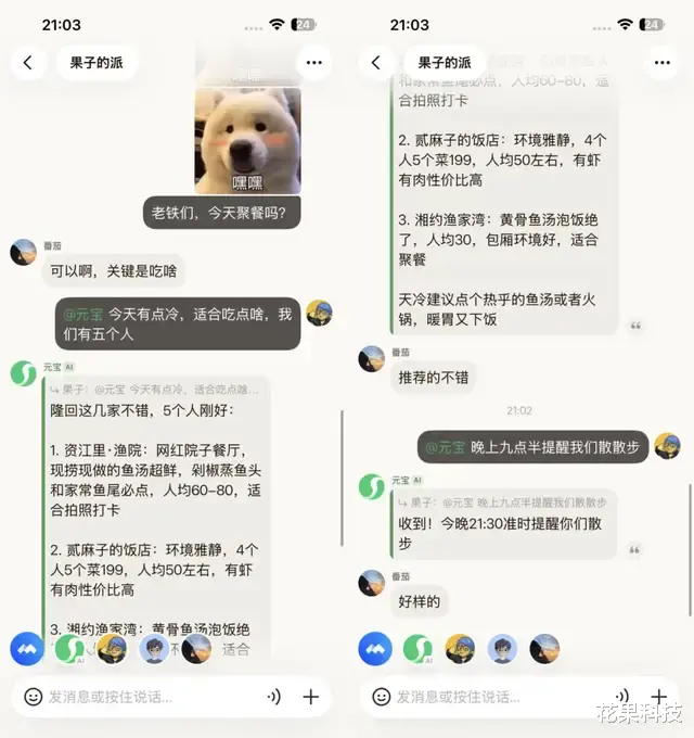 比如说派成员想要聚餐,但不知道吃啥,可以直接@元宝给出合适的建议,还能让元宝提醒聚餐后监督大家散步。