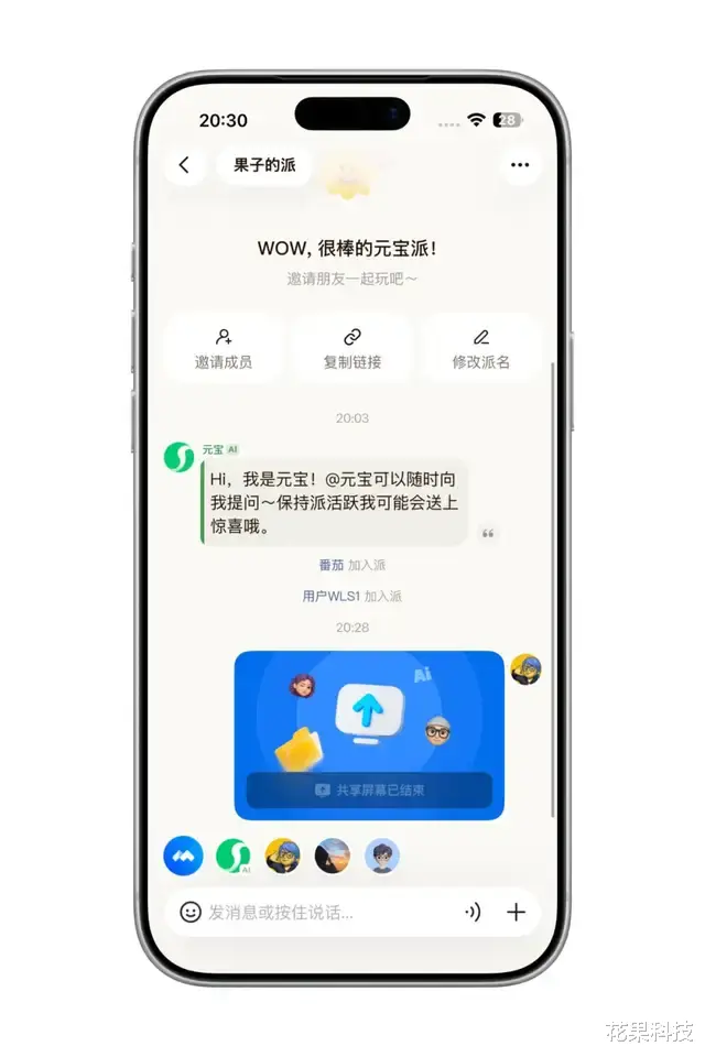 创建好的派可以邀请成员,可以将派理解为有 AI 的群聊,也就是说派内除了有真人之外,还有元宝 AI,可以直接在派内@元宝参与聊天讨论。