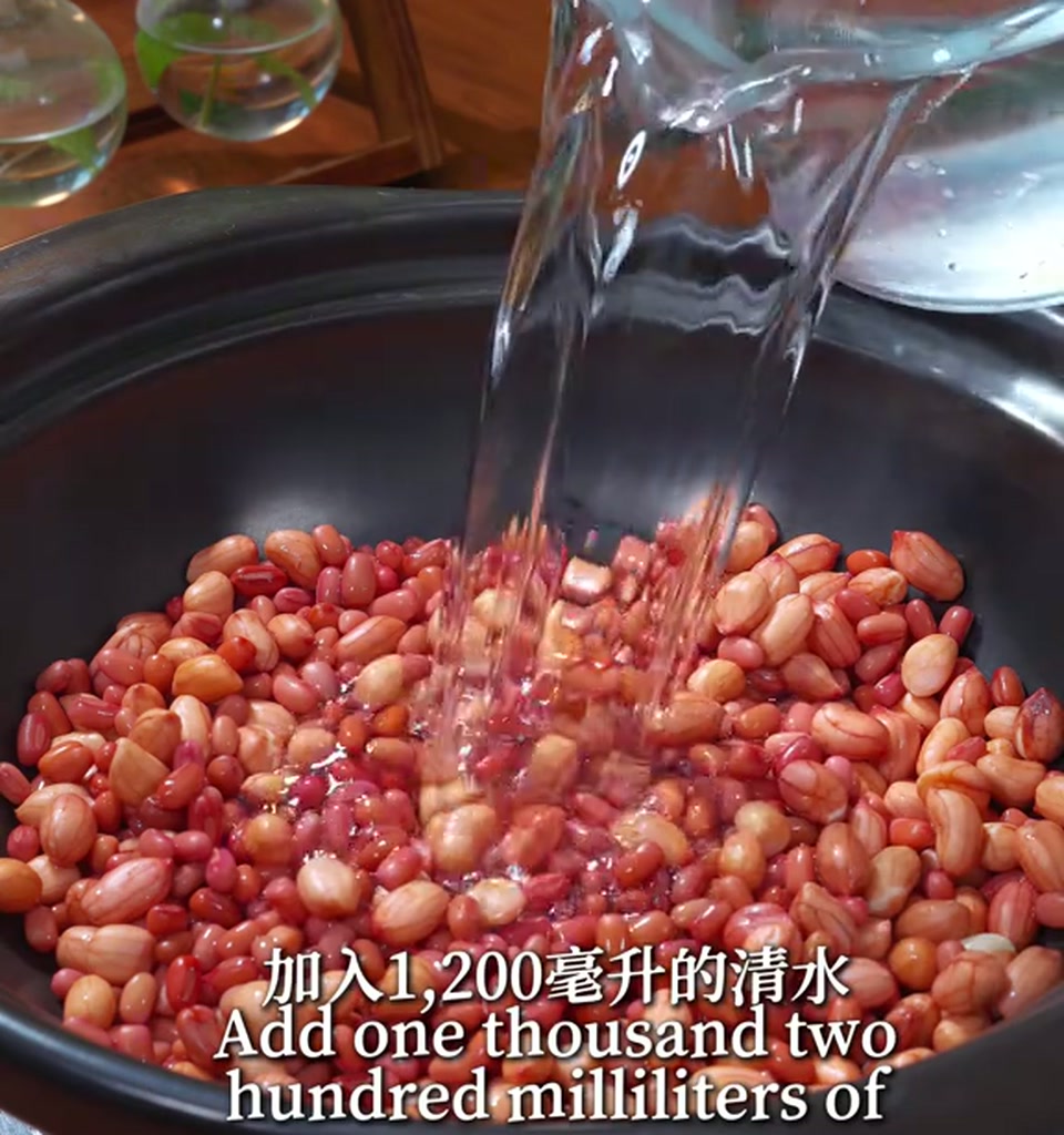 接着把洗净的红豆和花生倒进这个锅里面,加入1200毫升的清水。水一次性加足了,中途尽量别加冷水,不然口感就不够绵软了。