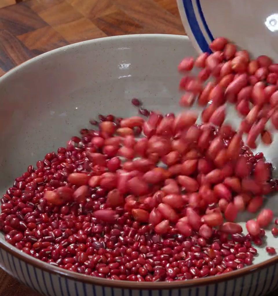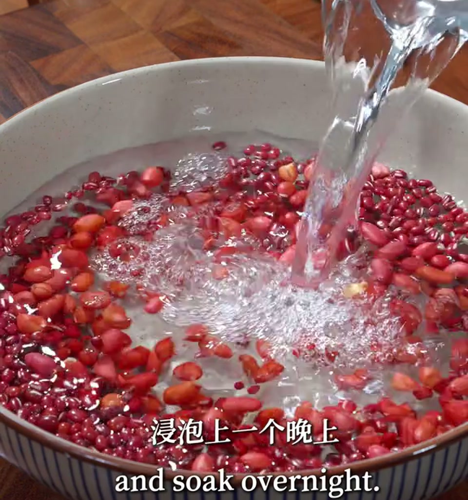 然后加入清水呢,浸泡上一个晚上。这一步就是我说的偷懒技巧,红豆这玩意儿硬,不泡透了很难煮开花。我是晚上睡觉前弄好放那儿,第二天起来正好。