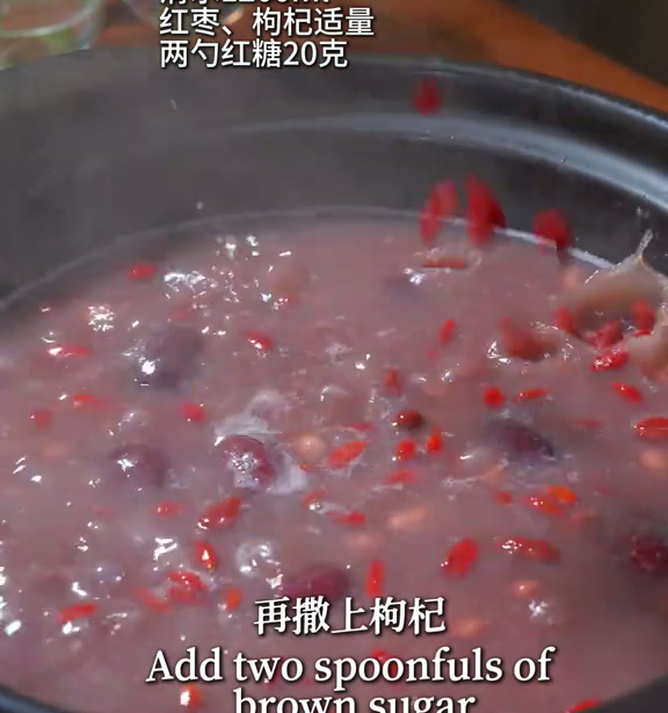 出锅前呢,再撒上一把洗净的枸杞,加两勺的红糖。红糖的分量看个人口味,我一般加20克左右,甜度正合适。搅拌均匀,让红糖完全化开即可。