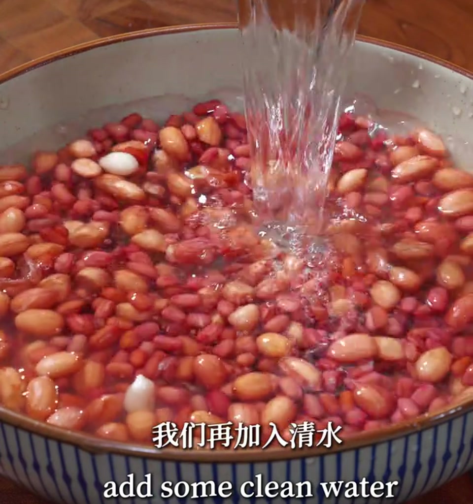 泡好之后呢,咱们把泡过的水倒掉(这个汤汁一定要倒掉,不然会有股豆腥味),再加入清水呢,给它清洗干净,沥干水分备用。