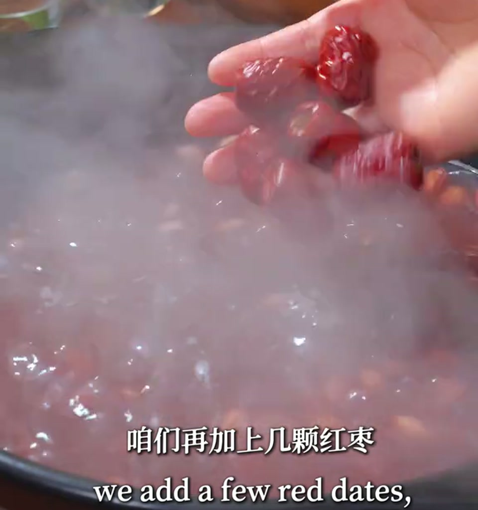 先开大火煮开,然后盖上盖子,改成小火,给它焖煮上30分钟。一定要用小火慢熬,让红豆和花生的营养慢慢释放出来,这时候屋里就能闻到阵阵豆香了。