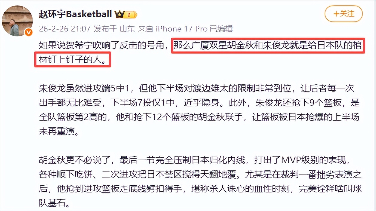 另一位媒体人付政浩也表达相同的观点。他指出,“朱俊龙全场得到6分9篮板看似不显山不露水,但实则是防守端的第一功臣。中国男篮全场拼下34个篮板,广厦出品的这两位球星合计摘下21个篮板,防守端的价值不言而喻。”赵环宇赞扬广厦双星胡金秋和朱俊龙就是给日本队的棺材钉上钉子的人。一点也没有说错。对此,你们怎么评论?