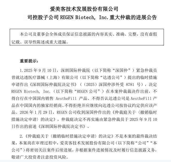 1月30日,爱美客发布公告宣布,子公司REGEN公司收到深圳国际仲裁院作出的《仲裁庭关于〈撤销临时措施决定申请〉的决定》,仲裁庭决定不再实施由紧急仲裁员于2025年9月10日作出的《深圳国际仲裁院决定书》。