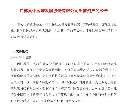 2月3日,江苏吴中发布公告称,拟将持有的全资孙公司上海吴中美学100%股权进行对外转让。受让方为上海青愈生物科技有限公司(以下简称“上海青愈生物”),交易价款为8000万元。