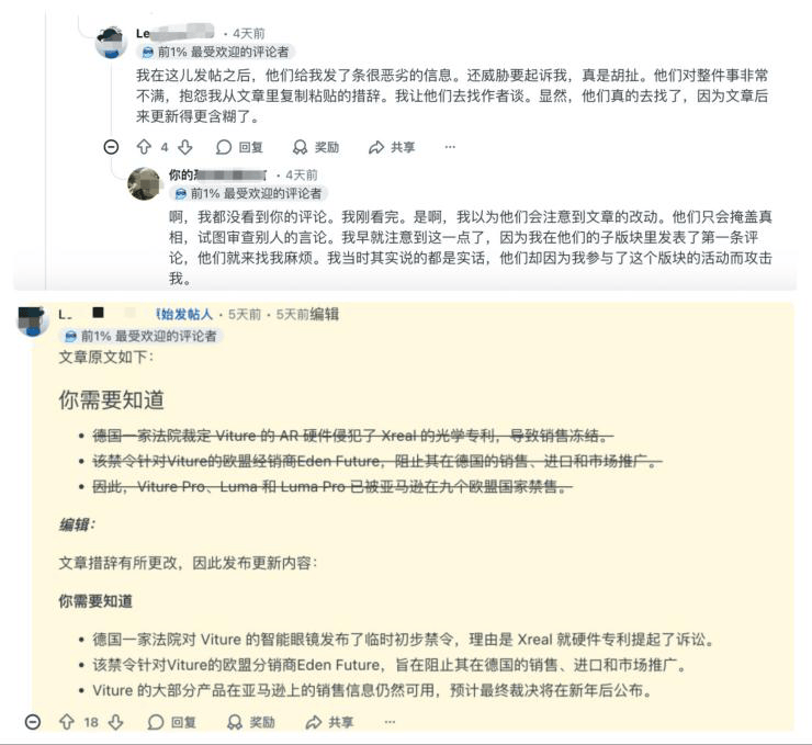 同时,在相关讨论区也有人表示自己在VITURE官方频道讨论该事件后被删帖,并且,该贴下面的网友回复耐人寻味。而该网友讨论的对象正是XREAL最新回应中,可能涉及禁售范围的VITURE Luma系列,该系列是目前VITURE的重点在售项目。