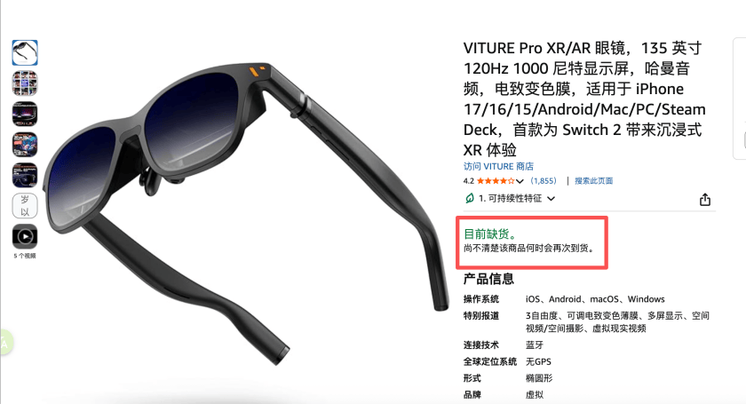 市象观察线上销售平台发现,截至12月27日,在亚马逊德国站点搜索“VITURE Pro”显示“目前缺货,尚不清楚何时会再次到货”,但Luma系列产品仍在售。同时VITURE Pro、Luma系列在亚马逊欧洲其他地区均处于在售状态。
