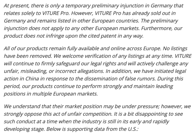 国内有媒体称当时就裁定结果以及经销商的说法向VITURE官方求证,得到的回复是:“You can always purchase our product on viture.com or on Amazon. Our product should not be banned from Germany.(您始终可以在viture.com或亚马逊上购买我们的产品。我们的产品不应该在德国被禁止。)”