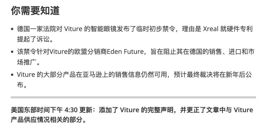 一个是在时间线上,德国慕尼黑第一地区法院在11月13日就当庭判决XREAL胜诉,临时禁令生效(禁止相关产品在德国市场销售、投入或使用),而媒体却在12月19日开始集中报道VITURE Pro在欧洲下架一事。