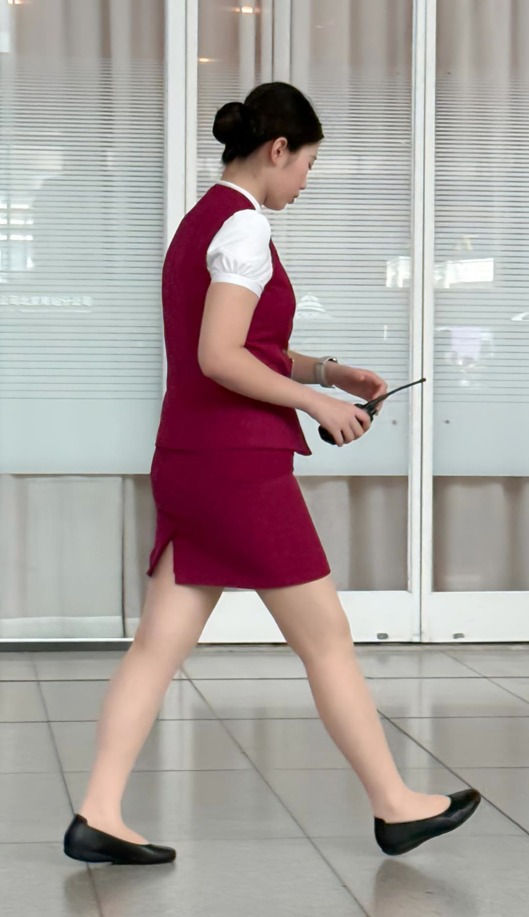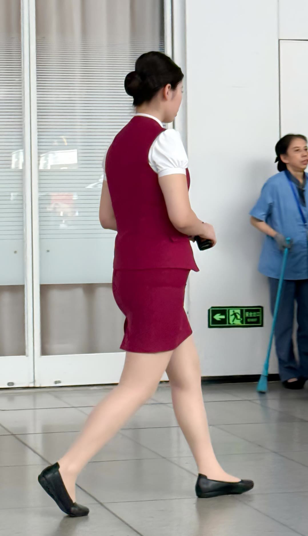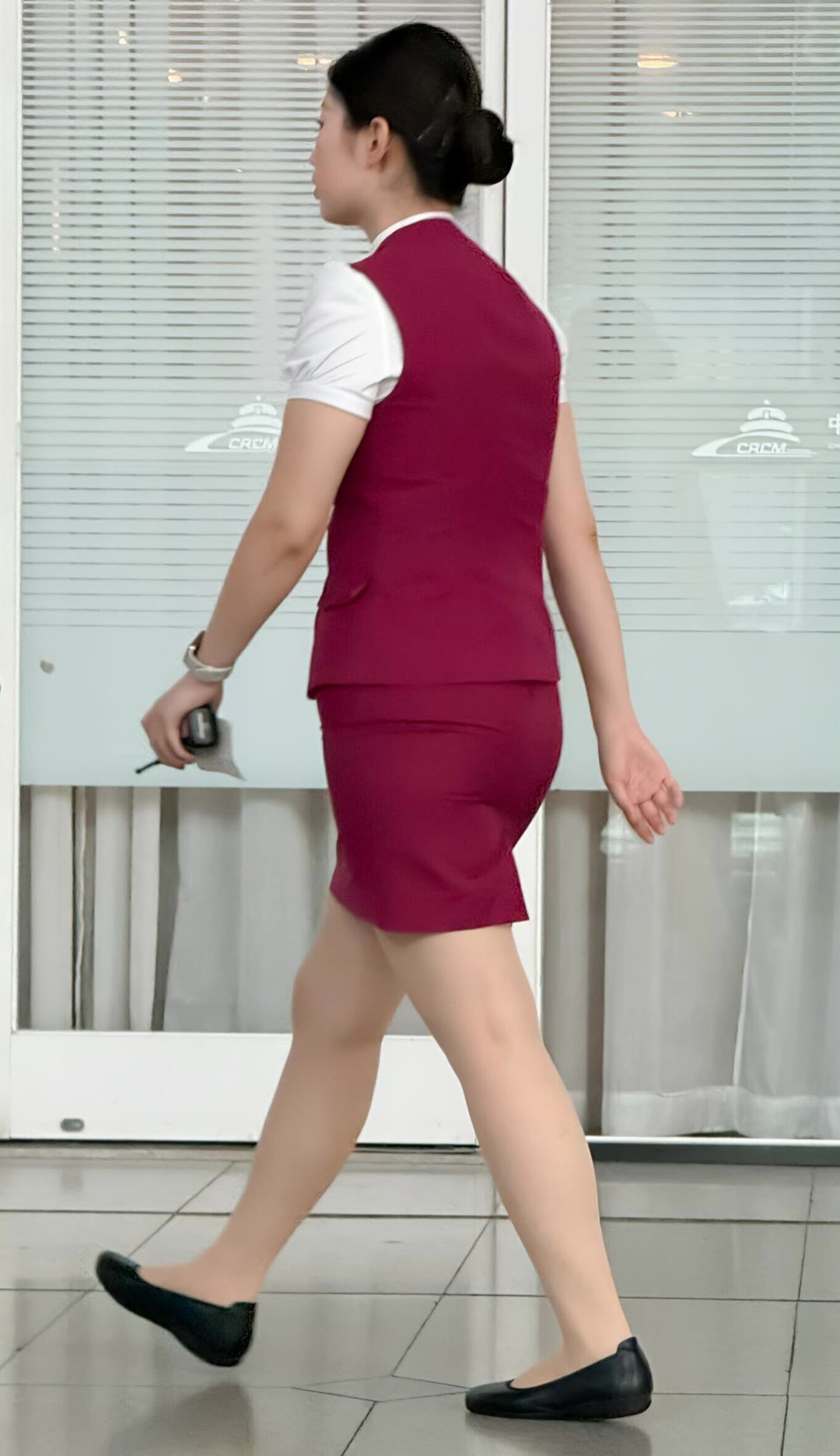她从车厢的流动中暂时抽身,站在了这里。那身高铁制服,在明亮却有些清冷的大厅灯光下,显得格外挺括和庄严。深色的外套,浅色的衬衫,每一粒扣子都规整,是一种无声的、关于秩序与可靠的语言。 而裙摆之下,一双浅肉色的丝袜,近乎透明地勾勒出腿部的线条,只在膝盖微微弯曲时,产生极细腻的、几乎看不见的褶皱——那是职业礼仪要求下,一层得体而密实的“第二层皮肤”。