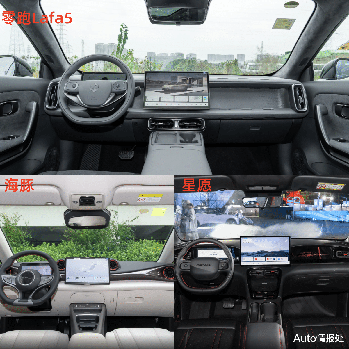 对于设计风格方面,小编不过多评价,毕竟审美这个环节,每个人的眼缘和感觉也都是不一样的,说下我的直观感受吧,零跑Lafa5整车给人的感觉更加大气,气场也是更足,更像是传统新能源车型,反观海豚和星愿更像是传统那种代步小车,给人的感觉比较小巧,总的来说,每个车型都有自己的特点,应用的场景和定位也是稍有不同。