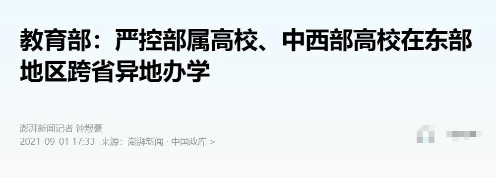 随后,教育部果断喊停,严控中西部高校跨省异地办学,同时“不鼓励东部高校从中西部、东北地区高校引进人才”。