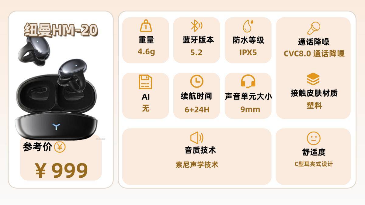 纽曼HM-20单耳4.6g,轻得像片小绒毛,戴去上班摸鱼一下午都没感觉。硅胶耳垫软乎乎的,C形耳夹能贴紧耳廓,跑步跳操都稳,但耳机本体偏大,耳背厚的朋友久戴3小时以上会有点压,个别用户还反馈有电流声,选的时候得留意品控。IPX5防水够应付运动暴汗,小雨淋到也不怕,擦干净照样用。