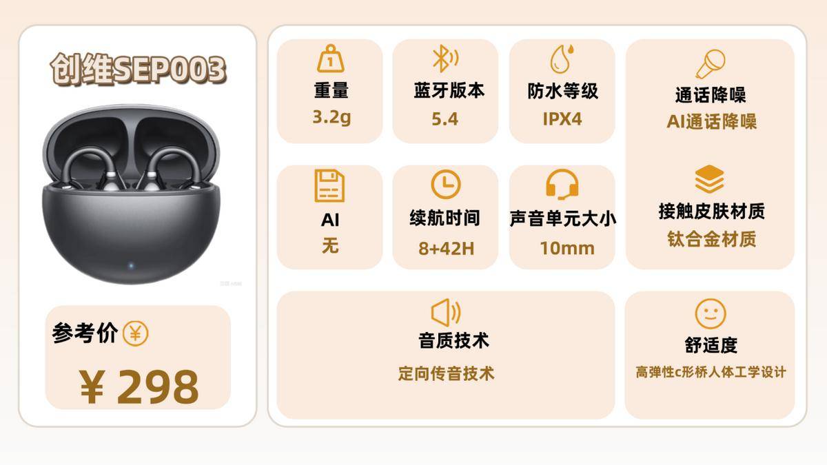 创维SEP003单耳才3.2g,比一颗回形针还轻,戴去逛超市买东西,结账时才发现没摘,存在感低到离谱。钛合金C形桥弹性超棒,270°均衡受力贴耳廓,跑步跳操狂甩都不掉,戴眼镜也不打架。但耳夹偏窄,久戴3小时以上会有点夹,得偶尔松一松。IPX4防水够应付运动出汗,就是别淋雨,防泼溅而已。