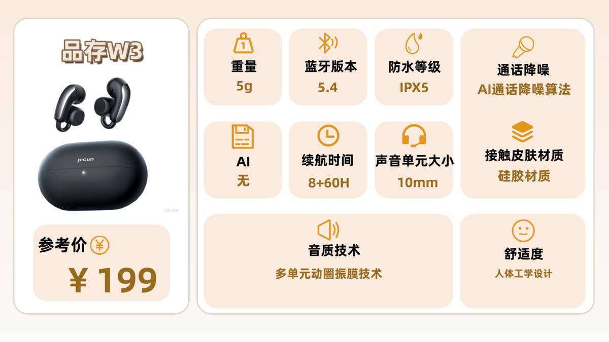 品存W3单耳才5g,轻得像没戴东西,戴去逛街一下午,朋友都没发现我戴了耳机。耳环式设计很潮,硅胶材质软乎乎的,人体工学C扣贴得特稳,跑步跳操都不掉,IPX5防水连小雨都不怕。但耳夹展开幅度小,耳朵大的朋友戴起来会有点紧,久超3小时耳廓会发酸,得偶尔松一松。