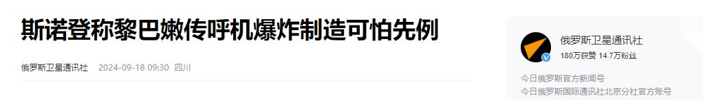 俄罗斯卫星通讯社——斯诺登称黎巴嫩传呼机爆炸制造可怕先例