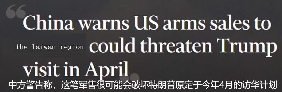 三位知情人士透露,中国已经就这套军售方案向美方私下表达了“严重关切”。中方警告称,这笔军售很可能会破坏特朗普原定的访华计划。另有消息人士表示,特朗普政府原计划在本月就将该军售案通知国会,但考虑到中方目前的强硬态度,特朗普可能会推迟这项行动,直到他结束访华后。