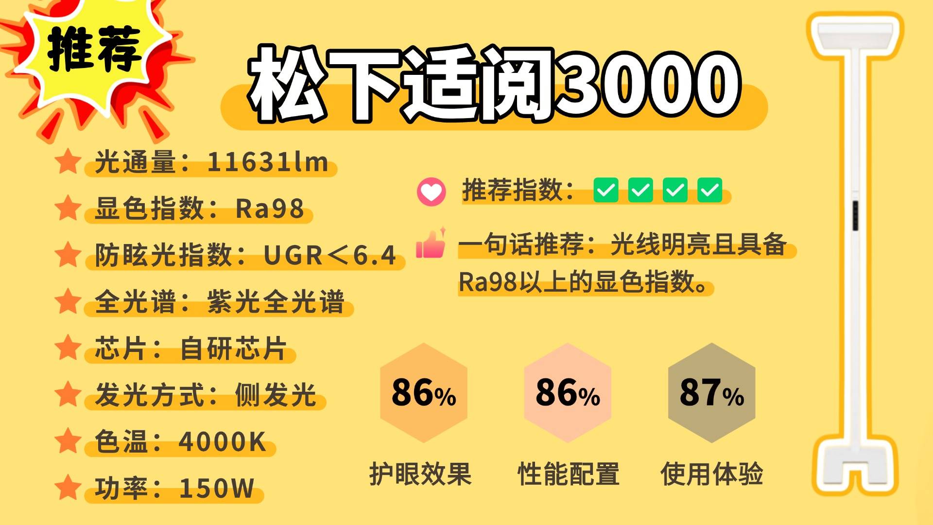 什么牌子的大路灯护眼好用又便宜?松下适阅3000采用SunLike紫光芯片,通过紫光激发路径避开传统蓝光灯珠容易出现的高峰蓝光问题,从光源端降低有害蓝光比例,硬件配置上,整灯搭载约 420颗全光谱灯珠,光通量可达约11600lm,配合发光面上的眩光抑制涂层,照明范围更广,光线分布也更均衡,需要注意的是,这款灯在结构设计上并未提供上下光源独立调节,同时整体定价偏高,适合有点预算的伙伴去选择。