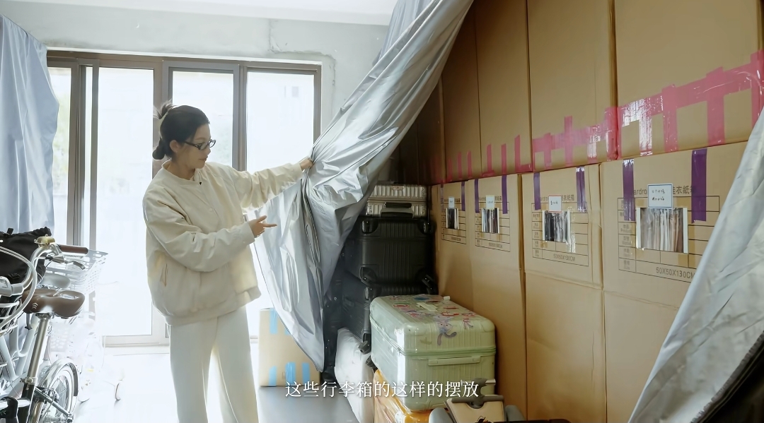 杨子姗展示她的衣帽间,衣服全都是用纸箱装着,然后里面另套了一个防灰的塑料袋,杨子姗解释之所以这样做是因为现在她刚到上海,还是租房住,所以之后还得继续搬家,所以索性就这样放纸箱里,到时候再搬家也就很方便。