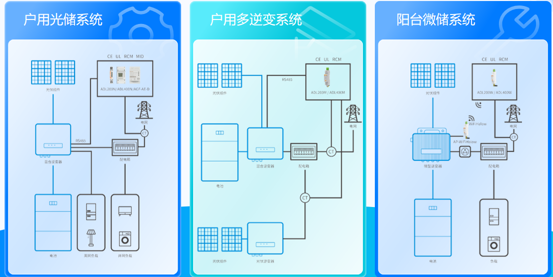 方案采用 ADL200W/ADL400W 系列电表,搭配模块化设计的光伏组件与微型逆变器,通过无线通讯功能简化安装流程,以低成本、便捷化的方式实现能源自主,完美适配阳台等小空间安装需求。