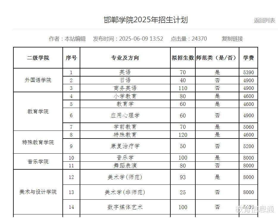 作为一所师范背景的普通本科高校,从师范高专到去“师范”本科院校,师范专业仍然是学校的优势特色。根据学校发布的《邯郸学院2025年招生计划》,51个专业及方向,师范类占17个,拟招生人数3800人,而师范类人数1335人。师范专业占专业总数的33%,师范人数占总人数的35%。
